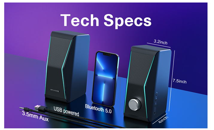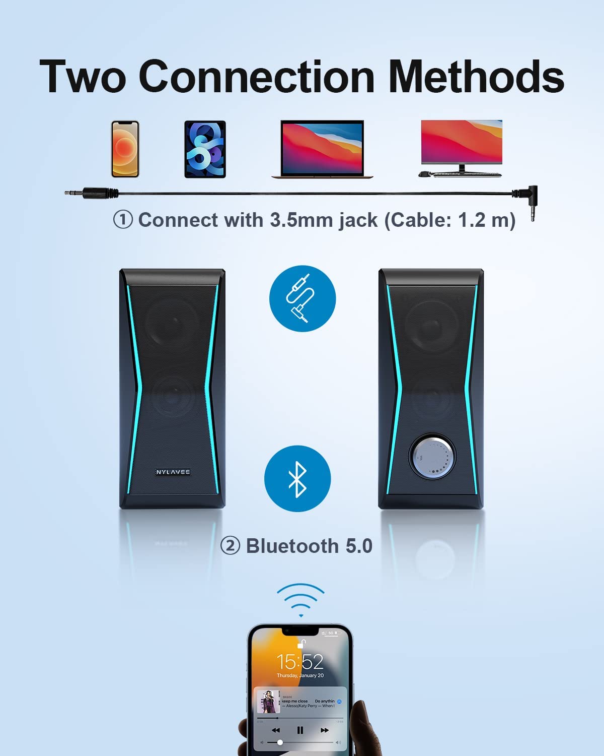 • ✅【Dual Connection & USB Powered】Can be connected via Bluetooth 5.0 and 3.5 mm AUX-in connection; USB powered computer speakers for seamless plug-and-play installation