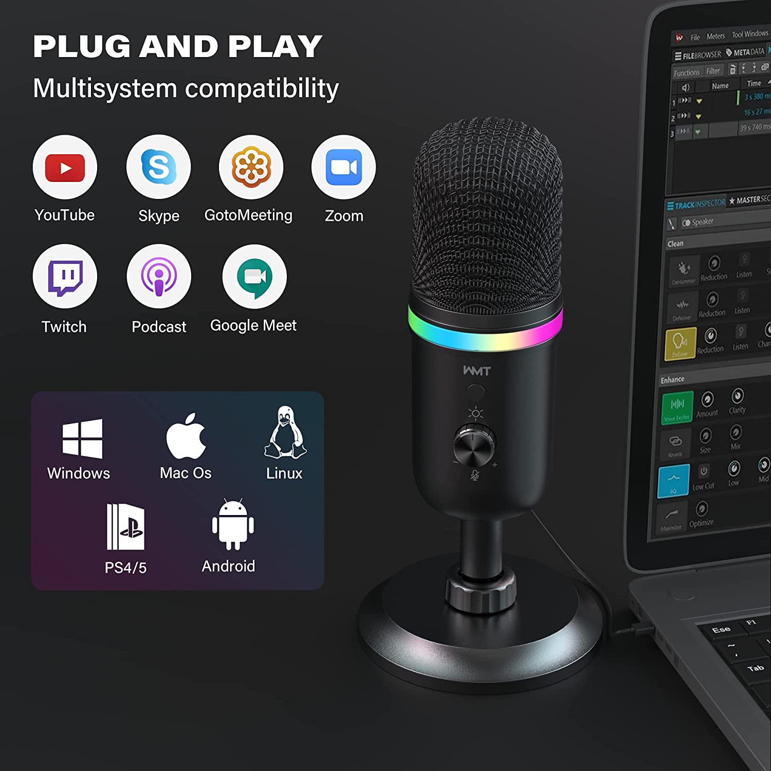 WMT USB Microphone, Condenser Gaming Microphone for PC/MAC/PS4/PS5/Phone- Cardioid Mic with Brilliant RGB Lighting Headphone Output Volume Control, Mute Button, for Streaming Podcast YouTube Discord