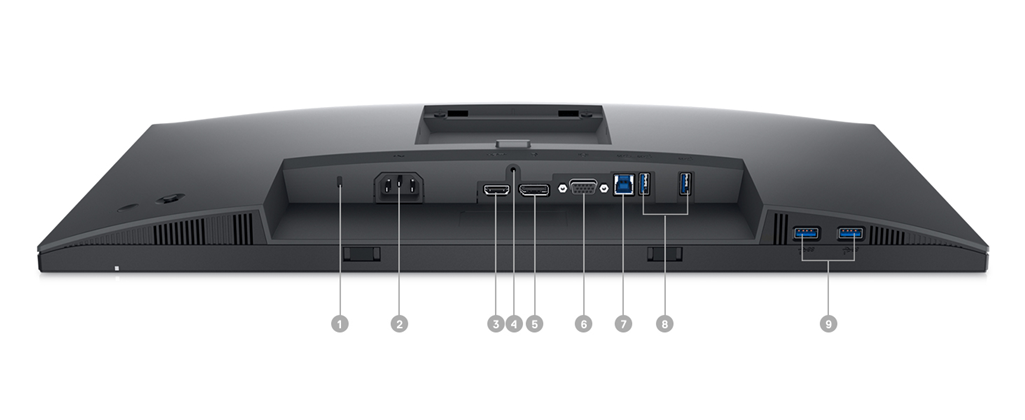 Expand your efficiency: The three-sided ultrathin bezel design lets you enjoy an uninterrupted view of your content across multiple monitors. Furthermore, you can boost your productivity by 21% with a dual monitor setup.1. Security-lock slot | 2. Power connector | 3. HDMI port | 4. Stand lock | 5. DisplayPort | 6. VGA connector | 7. SuperSpeed USB 5Gbps upstream port | 8. SuperSpeed USB 5Gbps downstream port | 9. SuperSpeed USB 5Gbps downstream port