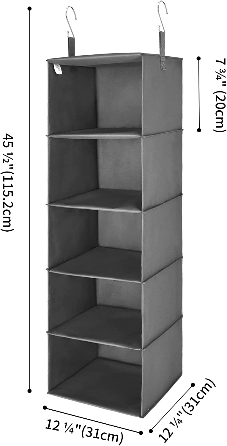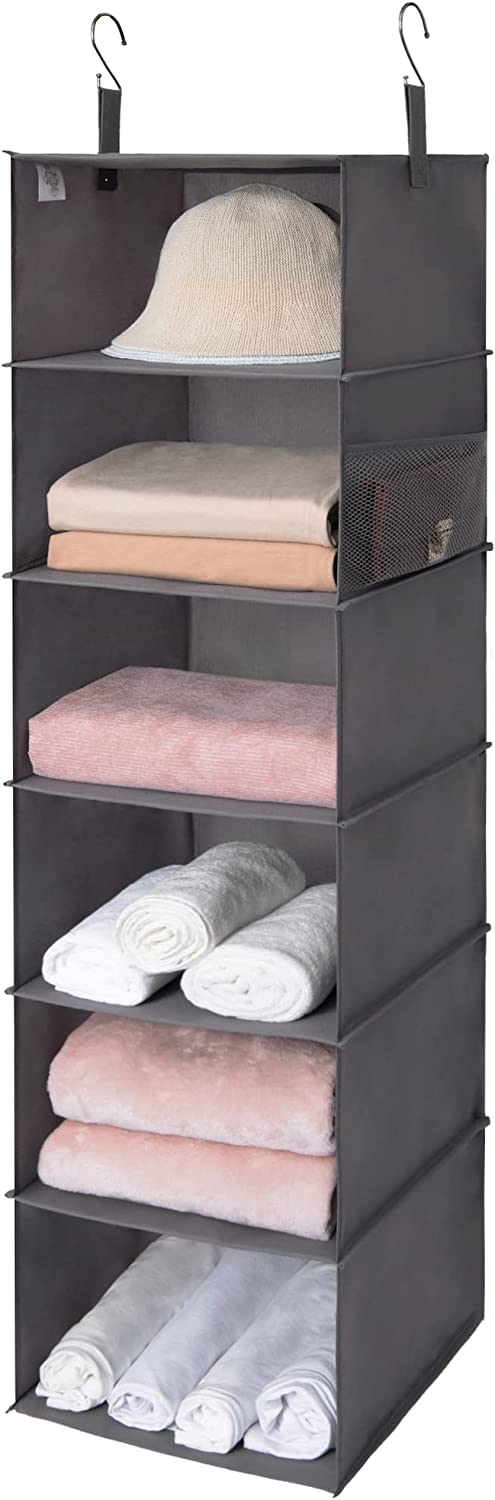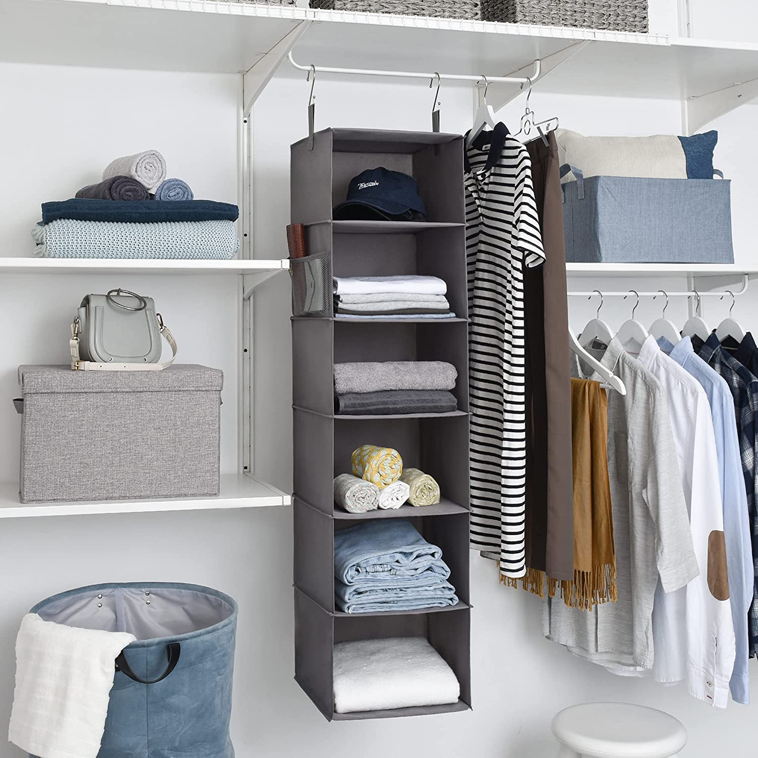 • 6-shelf hanging clothes organizer offers ample space for storage in bedrooms, playrooms, laundry rooms, or college dorm rooms.