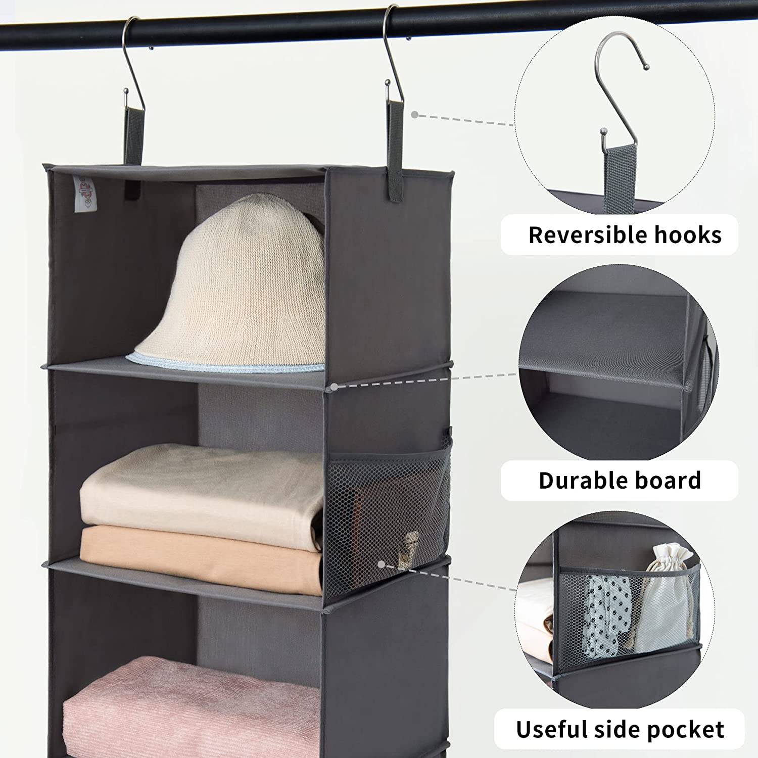 • The durable hanging organizer with reinforced shelves adds instant extra hanging space to a closet, perfect for sweaters, shirts, and other clothing.