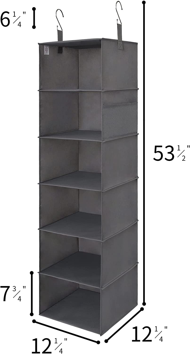 • 12 ¼" L x 12 ¼" W x 53 ½" H the 6-shelf hanging closet organizer measures, and each compartment dimension is 12 ¼" L x 12 ¼" W x 7 ¾" H.
