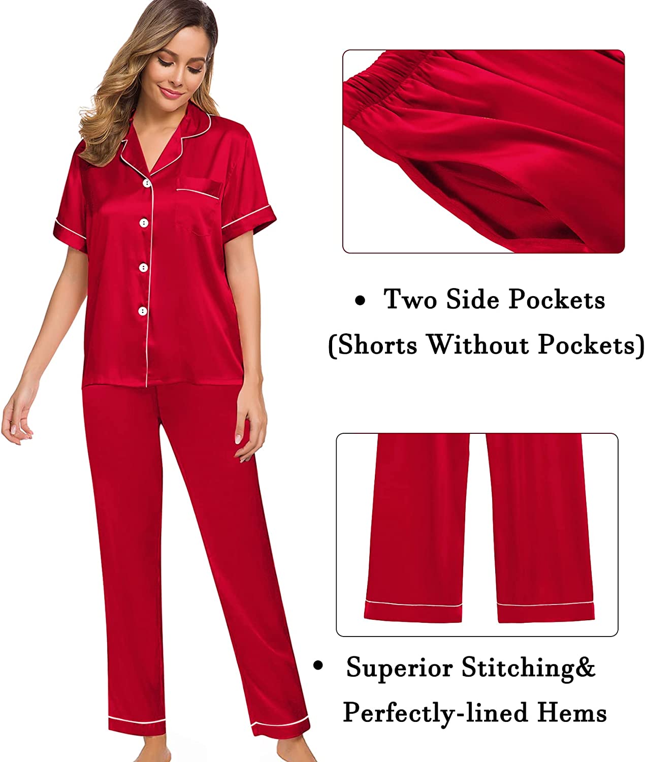 UNIQUE DESIGN & FEATURES: ?Button Front Pajamas Shirt with notch collar and one chest pocket design. ?Pajama Shorts for Women with soft elastic waist that fits for any body size and makes relaxing as comfort as possible.? Long Lounge Pants with two side pockets are convenient for you to carry small things like a phone, a wallet, keys. Loose fit for maximum free, sleep pants with superior stitching, perfectly-lined hems which is more classic. Perfect for sleepwear, nightwear or loungewear.