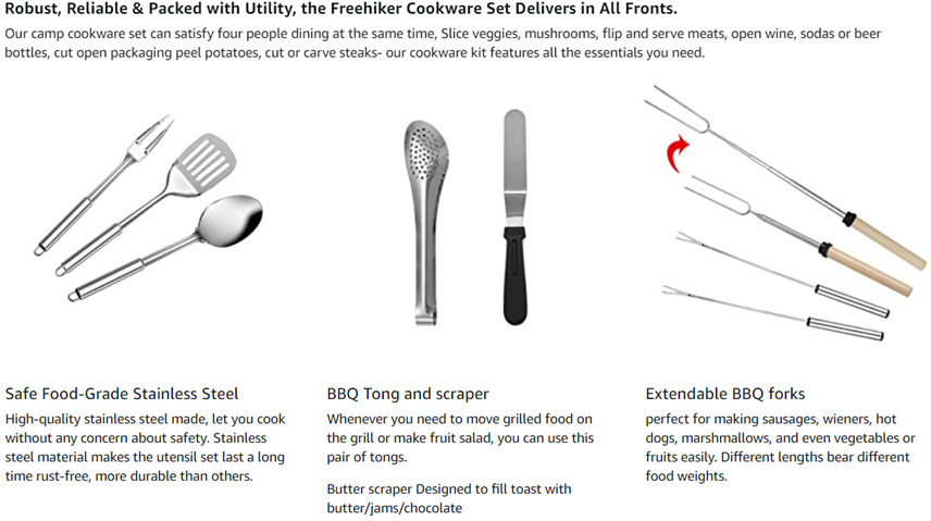 • ✅ Robust cookware made for the outdoors, When outside of your home’s comfort zone, you need camping accessories you can count on, our outdoor cooking kit features cutlery 100% made with high-end Stainless Steel for enhanced durability & reliability. Our utensils are also dishwasher-safe and are made to withstand years of constant use.