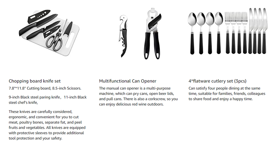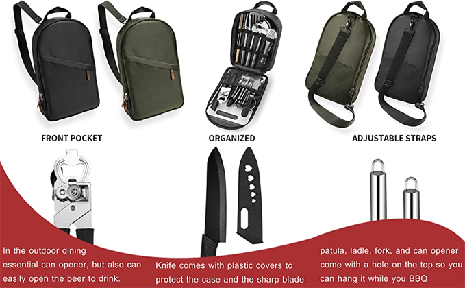 Included Components‎1*storage bag, 1*cutting board, 1*barbecue fork, 1*slotted tongs, 1*paring knife, 1*chef's knife, 1*wine opener, 1*can opener, 1*ladle, 1*scissors, 1*scraper, 1*slotted turner, 2*barbecue skewers, 2*extendable BBQ forks, 4*flatware cutlery set(3pcs), bag.