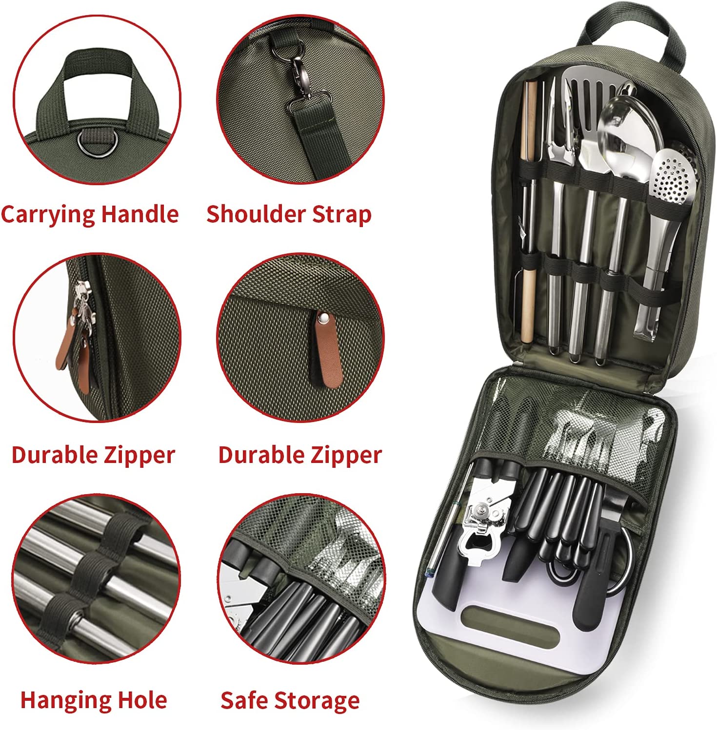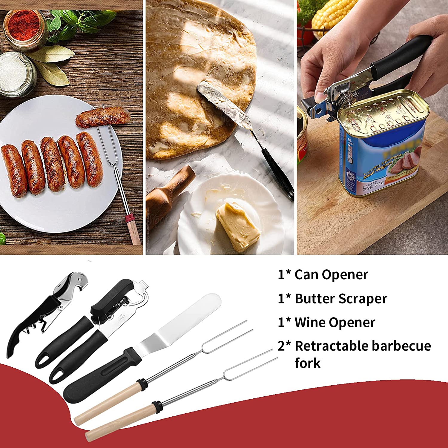 • ✅ A mini kitchen on the go- Our portable utensil organizer fits all the essential kitchenware for the comfiest outdoors dining experience: 1*storage bag, 1*cutting board, 1*barbecue fork, 1*slotted tongs, 1*paring knife, 1*chef's knife, 1*wine opener, 1*can opener, 1*ladle, 1*scissors, 1*scraper, 1*slotted turner, 2*barbecue skewers, 2*extendable BBQ forks, 4*flatware cutlery set(3pcs). - Plus, the bag has additional space so you can personalize your kit.