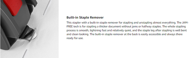 - 【JAM-FREE Stapler for Desk】This stapler with a built-in staple remover for stapling and unstapling almost everything. The JAM-FREE tech is for stapling a thicker document without jams or halfway staples. The whole stapling process is smooth, lightning fast and relatively quiet, and the staple leg after stapling is well bent and clean looking. The built-in staple remover at the back is easily accessible and always there ready for use.