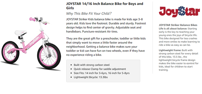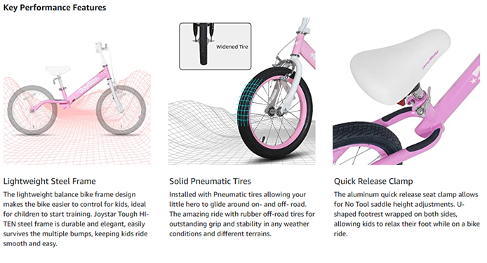 With no pedals or gears, we made the JOYSTAR to help your little rider find their balance by making it as easy as possible to put their feet down. In fact, scooting around with their feet is how the balance bike moves (outside of gravity), so they'll get used to the feeling of riding without much of the risk. And with a redesigned frame, the new features a lower standover height to accommodate little riders, as well as a longer wheelbase for more stable scooting.
