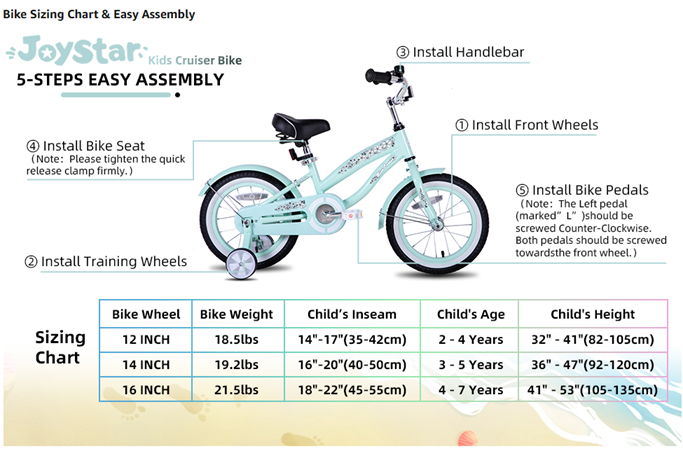 • SIZE CHART & OUR GUARANTEES-12 inch toddler bike is suitable for 2-4 years old (33-41 inch) boys & girls; 14 inch bike is suitable for 3-5 years old (35 - 47 inch); 16 inch kids bicycle is suitable for 4-7 years (41-53 inch). Adult assembly is required. The kid bike comes with 85% assembled body and the basic assembly tools, timely customer service and also limited lifetime warranty.