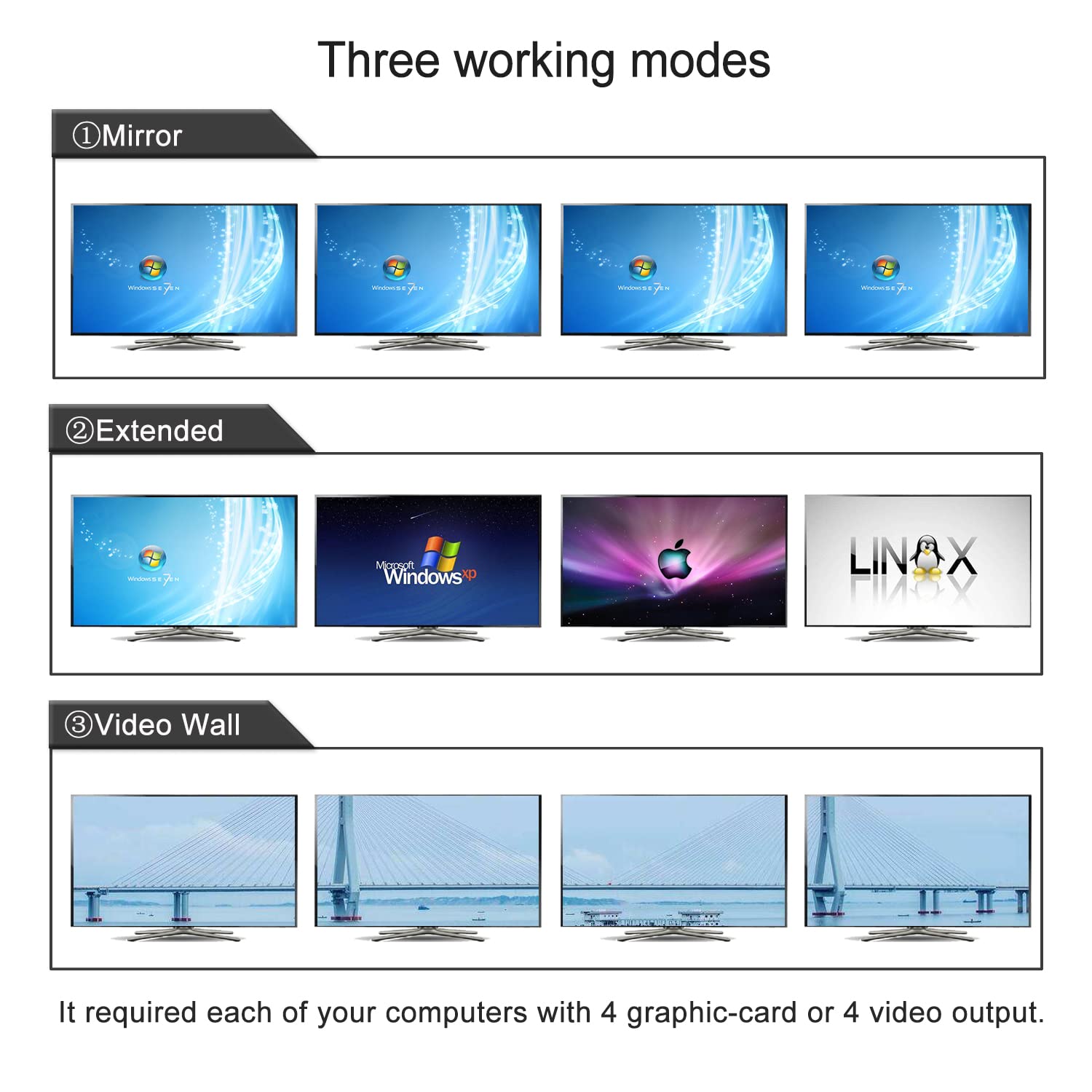 3. 8K KVM USB 3.0 Displayport: Support wired/wireless/unify/Bluetooth keyboard/mouse, Apple keyboard (hotkey is changeable), touch screen, OLED screen, 16:9 widescreen, 21:9 ultra-wide monitors, etc. (Bluetooth keyboard/mouse should with a receiver, it doesn't support built-in Bluetooth keyboard/mouse). support 3 display mode: extended display, mirror display and spliced display.