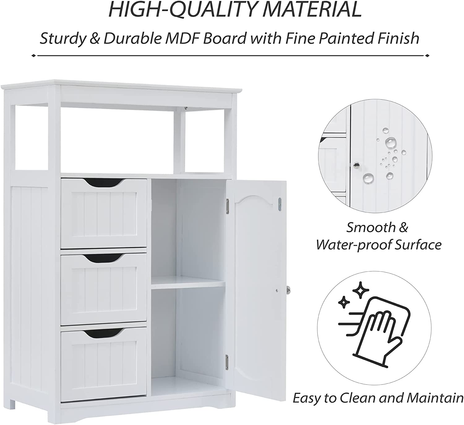 • Sturdy & Water-proof: This storage cabinet is made of high quality MDF board which is more good-quality than the usually-use particleboard in others. As the panel is waterproof and anti-stripping with a smooth surface, it is easy for you to maintain this bathroom cabinet which will even like a new one after being used for a long time.