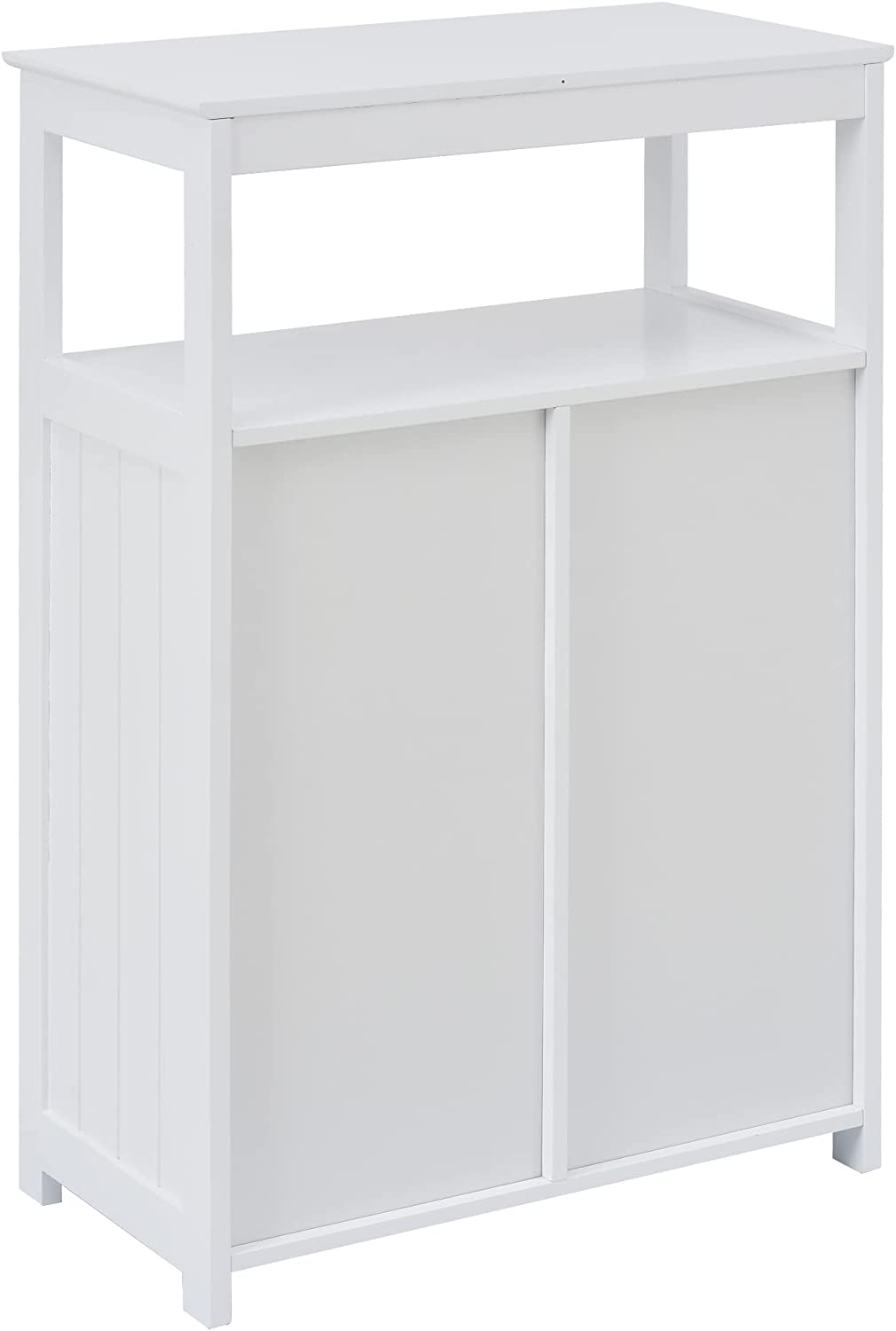 • Flexible Storage Space: This bathroom cabinet has a large and enough storage space: one top open shelf, three wide drawers, and one cabinet with door. You can put tissue, towels, shampoo, body lotion, soaps etc. into it. The upper open shelf allows easy taking stuff while the enclosed door and drawers keep dust away from your essentials.
