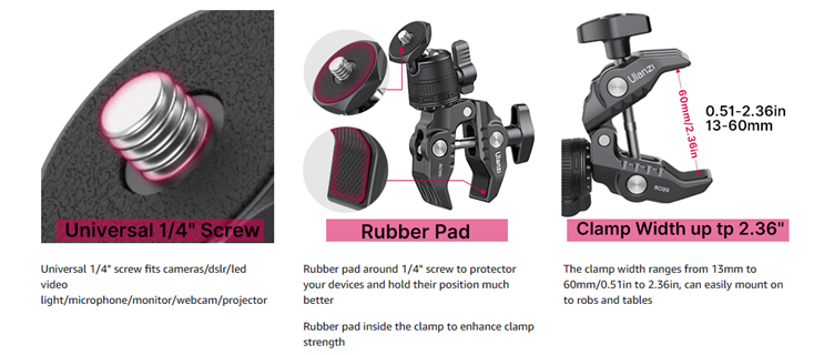 - Super Clamp: the open width of the super clamp ranges for 0.59in(15mm) to 2.3inch(60mm), which can help you fix the accessories on 2.3inch(60mm) rods/desktop. The super clamp enable you to add one more mounting position on desk/pole/tripod leg/camera cage/DJI Pole