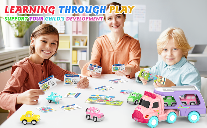 - ?【Toddler Toys Set】---LASCOTON 5-in-1 cartoon trailer truck cars set includes a large trailer and 3 different colorful cars & 1 airplane, which can helps children identify colors. The upgraded version of the rich color matching/cute cartoon expression/unique body printing brings more fun to the transport truck toy set.It's the best 1 2 3 year old girl gifts birthday or other festivals.