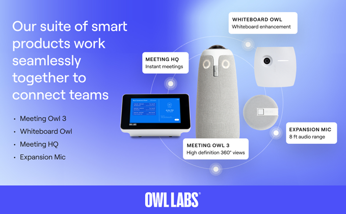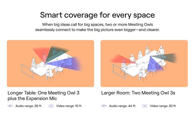 • ADAPTS TO ANY SPACE. Pair two Meeting Owls or add an Expansion Mic to expand video and audio reach in larger spaces. Compatible with Owl Labs’ Whiteboard Owl and Meeting HQ to complete your hybrid room setup.