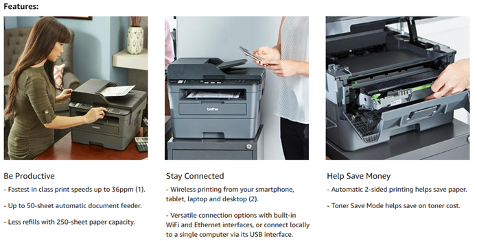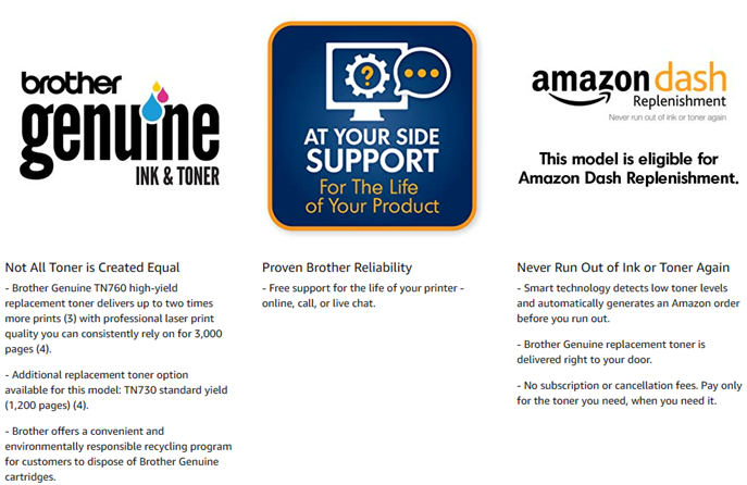Based on competing in-class monochrome laser multifunction printers under $300. Print speed specifications gathered from manufacturer websites as of 1/9/2017. Requires connection to a wireless network.TN-760 High Yield vs. TN-730 Standard Yield. Up to two times more prints and lower printing costs based on yields and MSRP. Standard Yield and High-yield cartridges sold separately.Approx. toner cartridge yield in accordance with ISO/IEC 19752 (letter/A4).Reprinted from PCMag with permission. Copyright 2017 Ziff Davis, LLC. All Rights Reserved.Approx. 300 pages per month in accordance with ISO/IEC 19752 (Letter/A4) using the 2 toners provided in box.Requires additional purchaseThe mobile device must have NFC capability and run Android OS 4.4 or later.