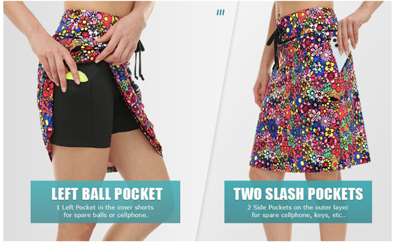 Skirt with 3 Pockets: 2 Side Pockets on the outer layer. 1 left pocket on the inner shorts.Great for your carry on items.
