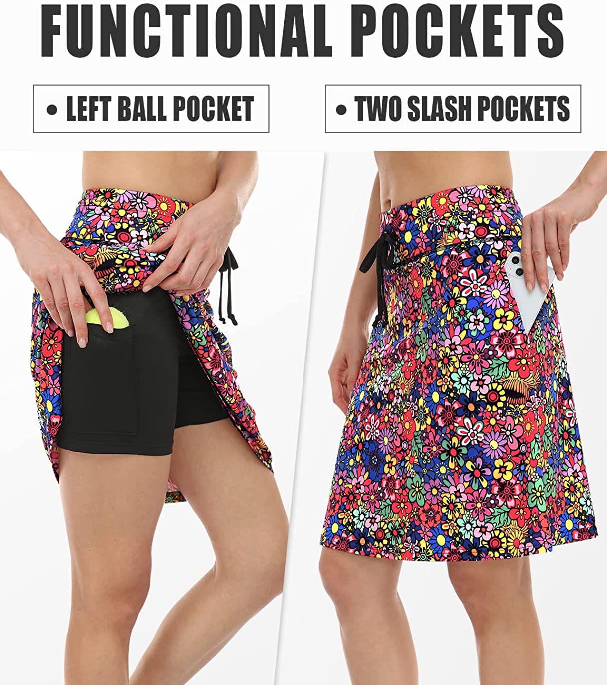 2-in-1: The Womens Knee Length Skirts with outer&inner layers keeps your underwear hidden as you bench and stretch without worries about exposure.