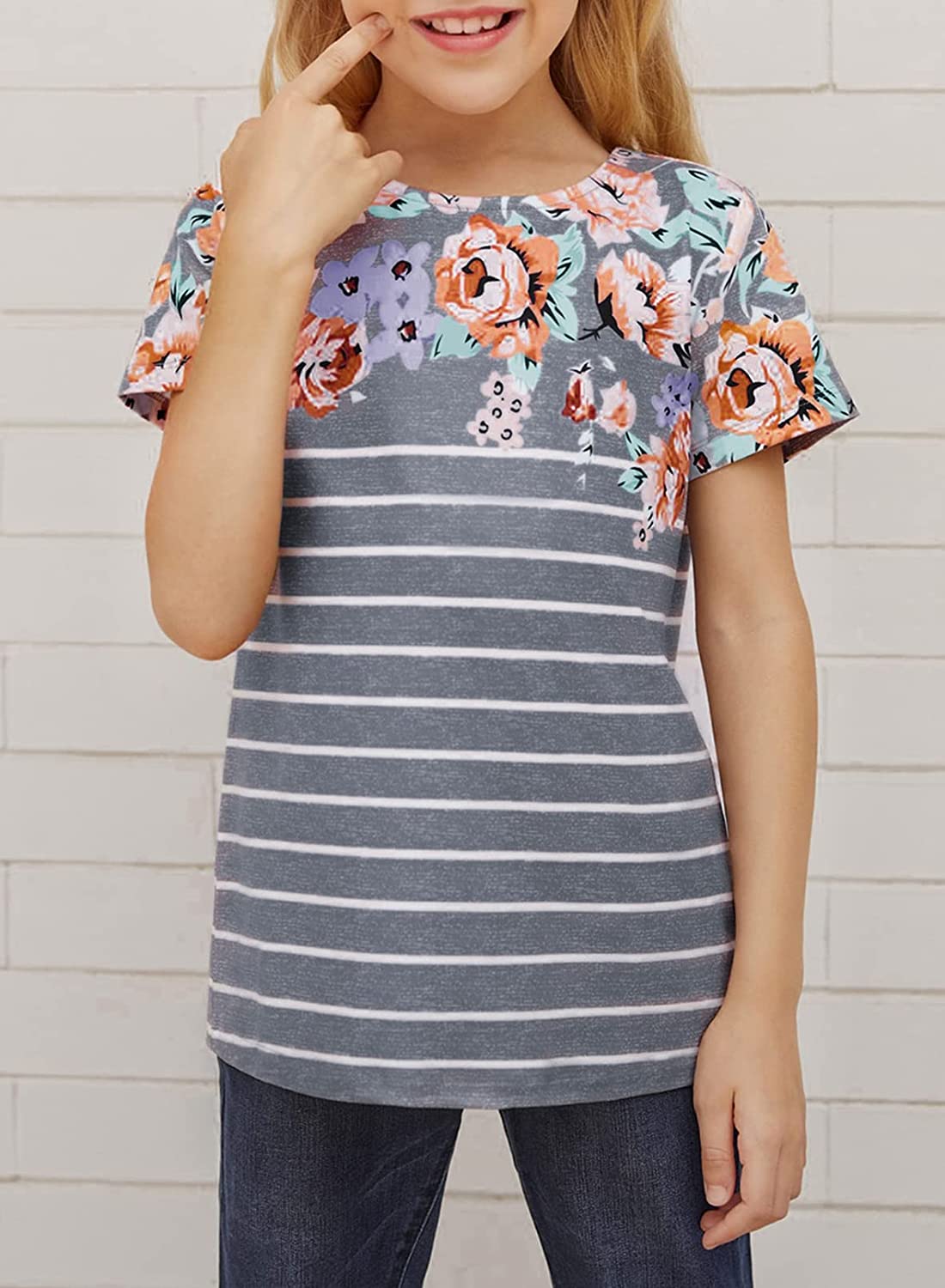 Features: Short sleeve Shirts for teen girls, girls round neck shirts, cutes tripes and fashion colorblock detail.Make your baby looked full of energy.