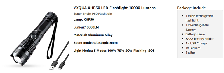Specific Uses | ● Long Range, ● Adjustable Light Modes, ● High Power, ● Adjustable Focus, ● Rechargeable, ● Impact Resistant |