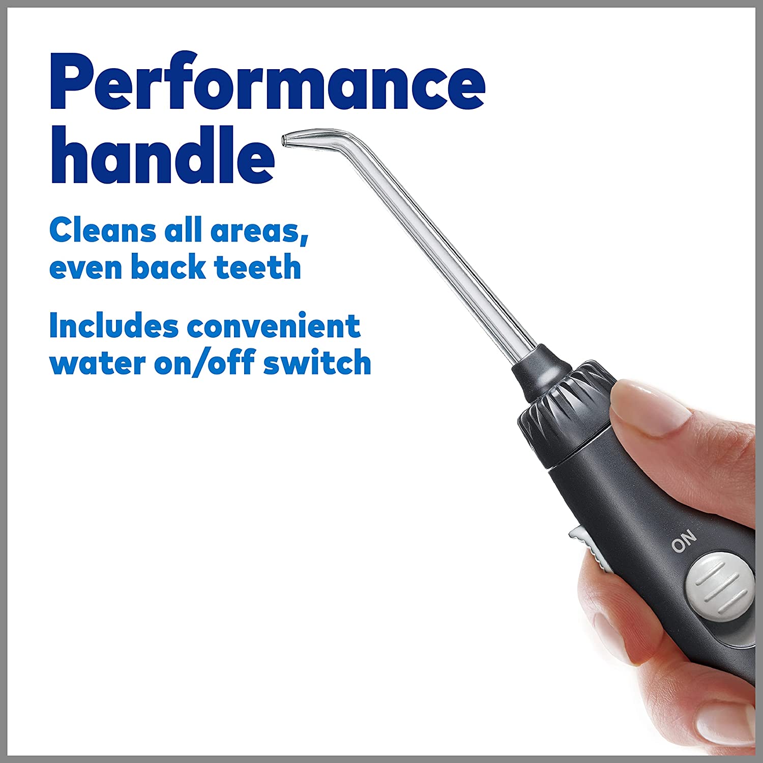 • HIGH VOLUME RESERVOIR AND SLIM HANDLE: Holds 22 ounces for 90 seconds of use, no refilling required. Small maneuverable handle makes it easy to floss all areas including back teeth and includes a convenient water on/off switch.