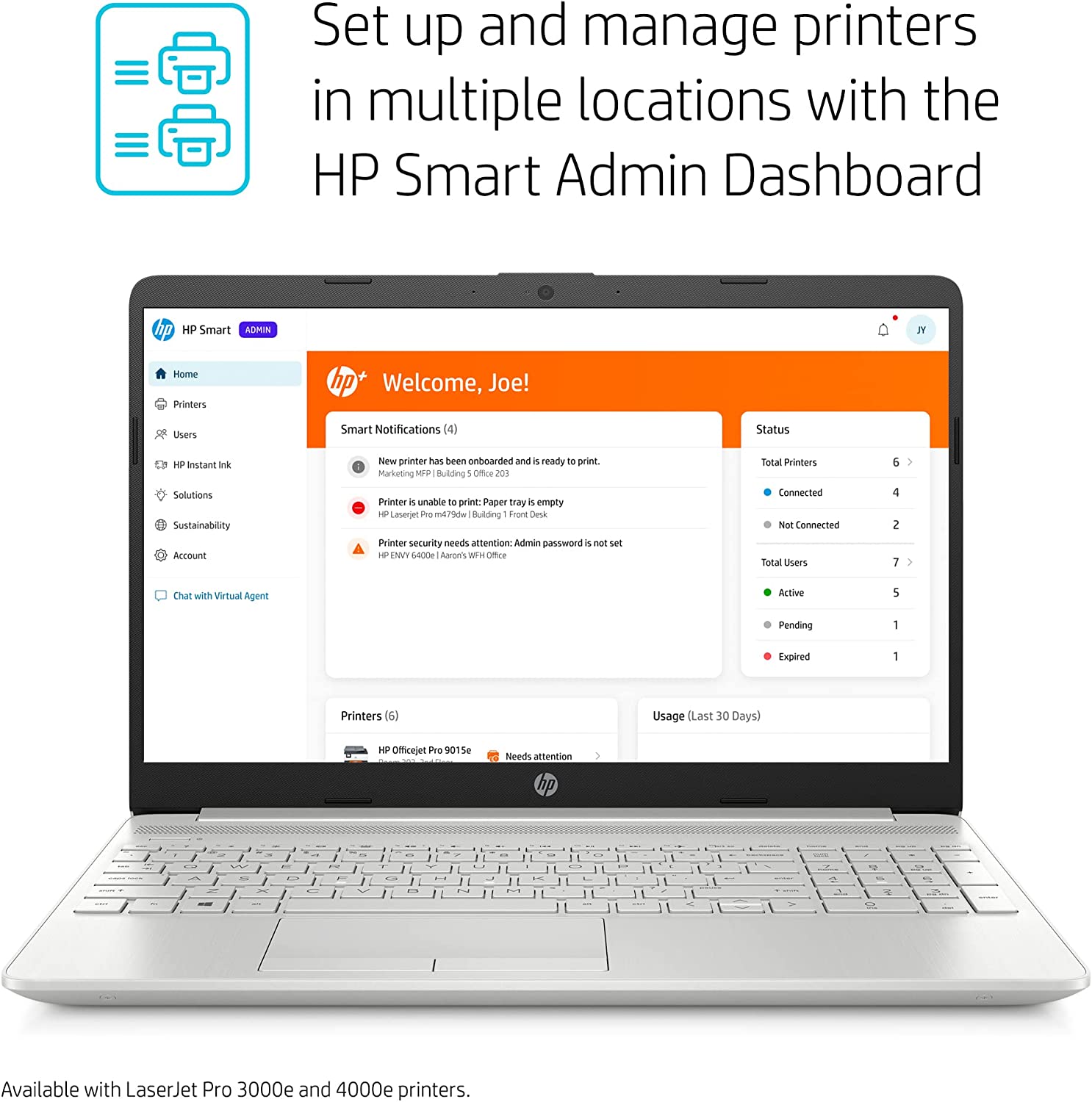 SET UP AND MANAGE FROM ANYWHERE – Perfect for teams in multiple locations. HP Smart Admin Dashboard lets you set up and manage printers from a single dashboard, invite new users, track toner levels, monitor security and control settings from any location.