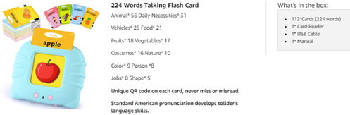 • ✅ [224 Sight Words] - Rich card content, Talking Flash Cards contains 224 sight words, covering all fields, including animals, vehicles, character, food and more. Expose toddler to many unknown objects, full of imagination.