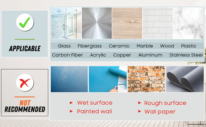- 【Using Tips】: Please keep the mounting surface dry, clean and free of oil when mounting to make instant and permanent bond and get great water and moisture resistance ability. Applying the tape vertically on the items can make stronger bonds. Please caution to use the tape in painted wall due to strong adhesion and the nature of painted wall, which may peel off painted wall upon removal.