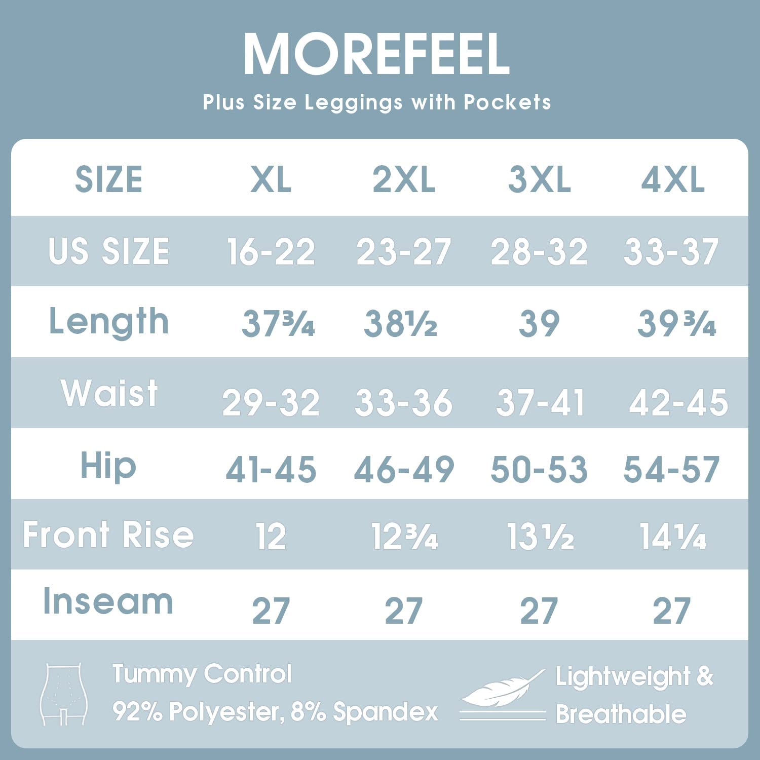 • ✅ PLUS SIZES FOR YOU - Plus leggings with pockets are stretchy to fit sizes 1X-4X. Please choose your size according our size chart. With MOREFEEL plus pockets leggings make you more confident and beautiful.