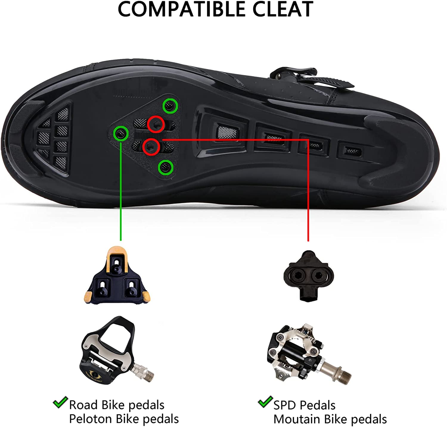 • 【Widely Compatiblity】: This bicycle shoe has a 2-bolt and 3-bolt sole design that is compatible with most cleat types including Look Delta,peleton bike,Shimano SPD,SPD-R & SPD-SL cleats,making it perfect for road cycling, MTB, and indoor cycling.