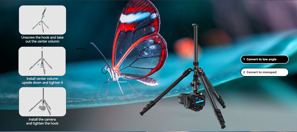 2-in-1 Tripod & Monopod: The aluminum tripod can be easily turned into a monopod or walking stick, it is a good companion for you to go hiking or traveling. And the central pole can be inverted to allow for low angle shooting and macro photography.