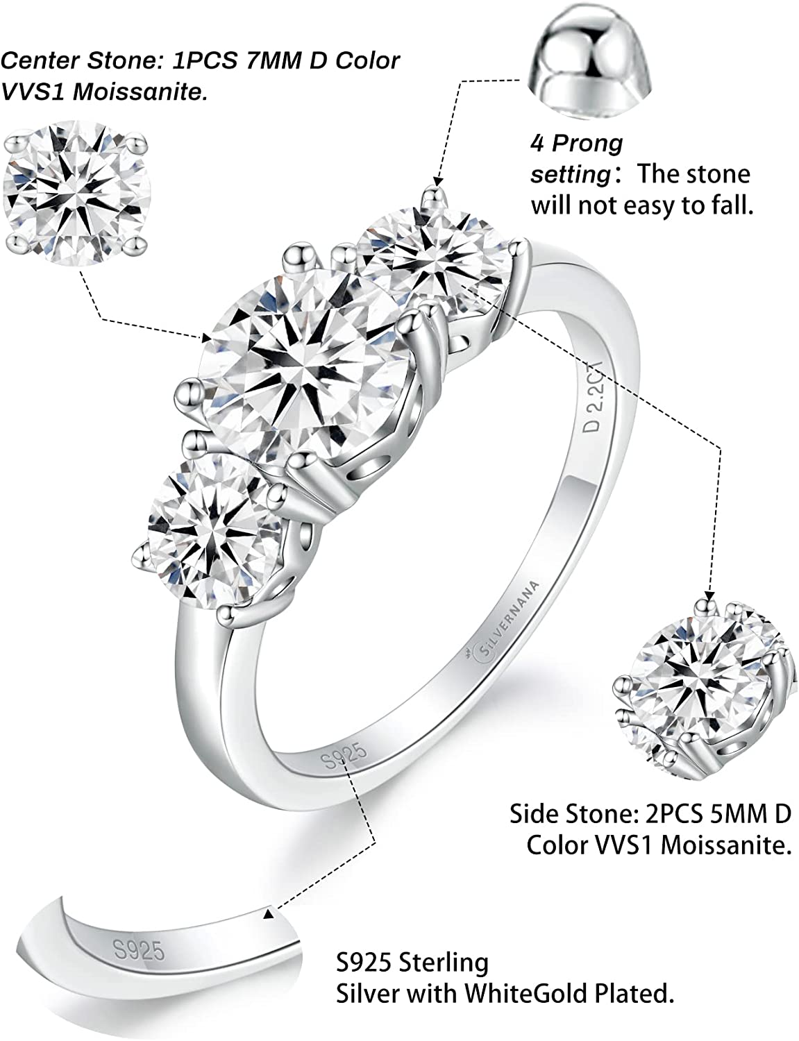 ?【3 STONES DESIGN】- This moissanite angagement ring for women is made with 1pcs of 7MM stone and 2pcs of 5MM stones. Some believe that the three stones represent the mother, father and child, and make together to symbolize happiness, love and loyalty, which with a classic style, very layered and looks more gorgeous and elegant than a solitaire ring.
