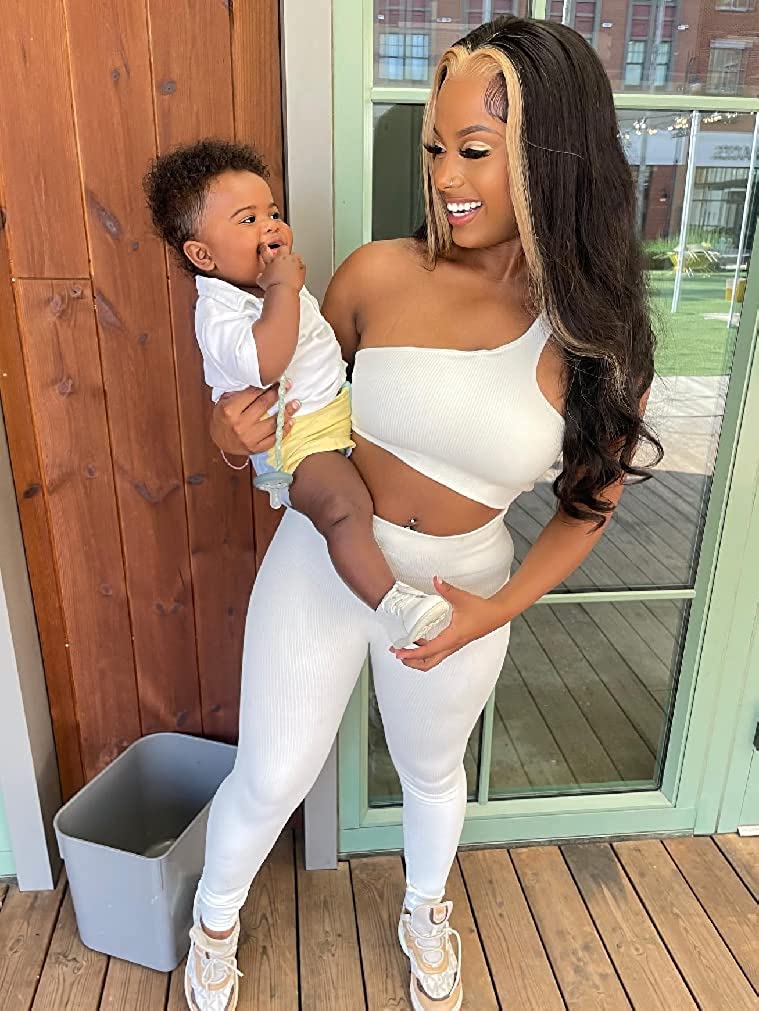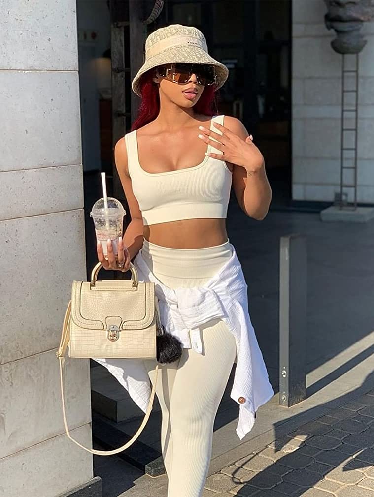 OQQ Women's 3 Piece Outfits Ribbed Seamless Exercise Scoop Neck Sports Bra One Shoulder Tops High Waist Leggings Active Set