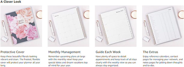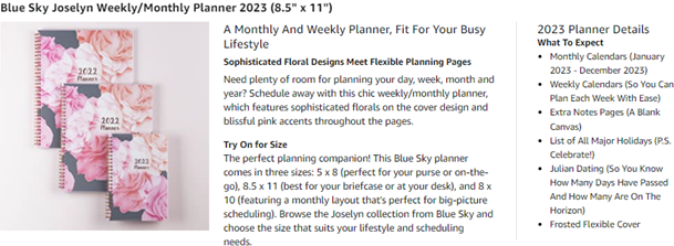 • January 2023 - December 2023 chic day planner with 12 months of monthly and weekly pages for easy year-round planning; 6 additional monthly pages (July 2022 - December 2022) are included