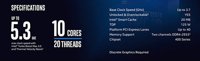 Intel Core i9-10900KF Desktop Processor 10 Cores up to 5.3 GHz Unlocked Without Processor Graphics LGA1200 (Intel 400 Series chipset) 125W