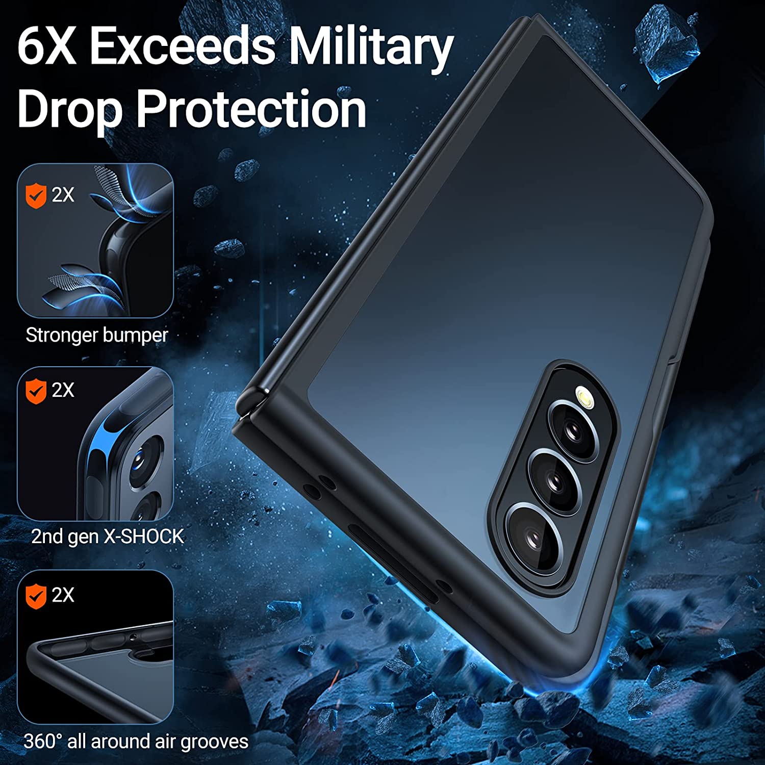 • [Certified Military Grade Protection] Z 4 fold case provides certified MIL-STD-810H protection, engineered with tough polycarbonate and soft flexible rubber bumper to protect your new Phone from daily wear and tear. It comes with build in 360° all-around powerful impact dispersion airbags and 4 corners equipped with 2nd gen X-SHOCK anti-collision angle technology strongly protect the protruding mobile phone from falling, collision and face-up or face-down injuries
