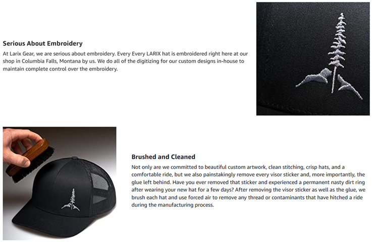 • SERIOUS ABOUT EMBROIDERY : Every Larix hat is embroidered right here at our shop in Columbia Falls Montana by us. It's our highest priority to achieve outstanding results by using the most advanced sewing technology and techniques available today.