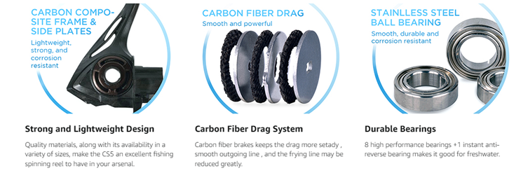 CS5 spinning reel features lightweight carbon composite frame and side plates, 8 ball bearings + 1 instant anti-reverse bearing, a powerful carbon fiber drag system, a strong machined aluminum spool, an ergonomic EVA handle knob, stainless steel main shaft, aluminum pinion gear and metal handle arm.