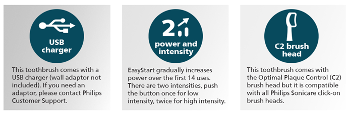 • Includes: 1 Philips Sonicare 4100 handle, 1 Optimal Plaque Control (C2) brush head, and 1 USB charger (wall adaptor not included)