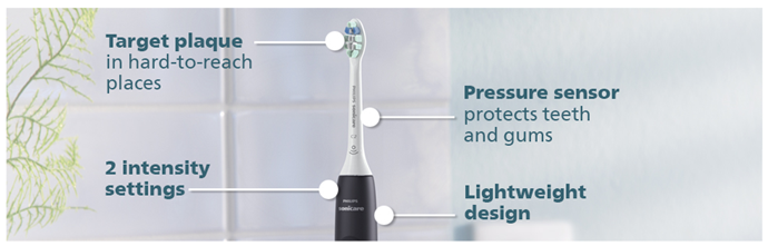 • Pressure sensor and two intensity settings protect sensitive gums from overbrushing