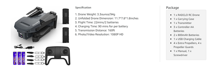 1080P HD Camera | Wide angle 1080P High definition FPV Wifi camera and 90° manually adjustable lens, allows you to enjoy real-time vivid aerial photos and videos, and creates an amazing impression of the flight for you. |