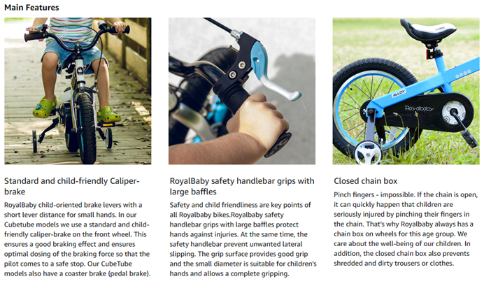 Special Feature | Handbrake and coaster brake, Adjustable Handlebars, Quick Release Seat, RoyalBaby exclusive premium parts, Adjustable Seat |