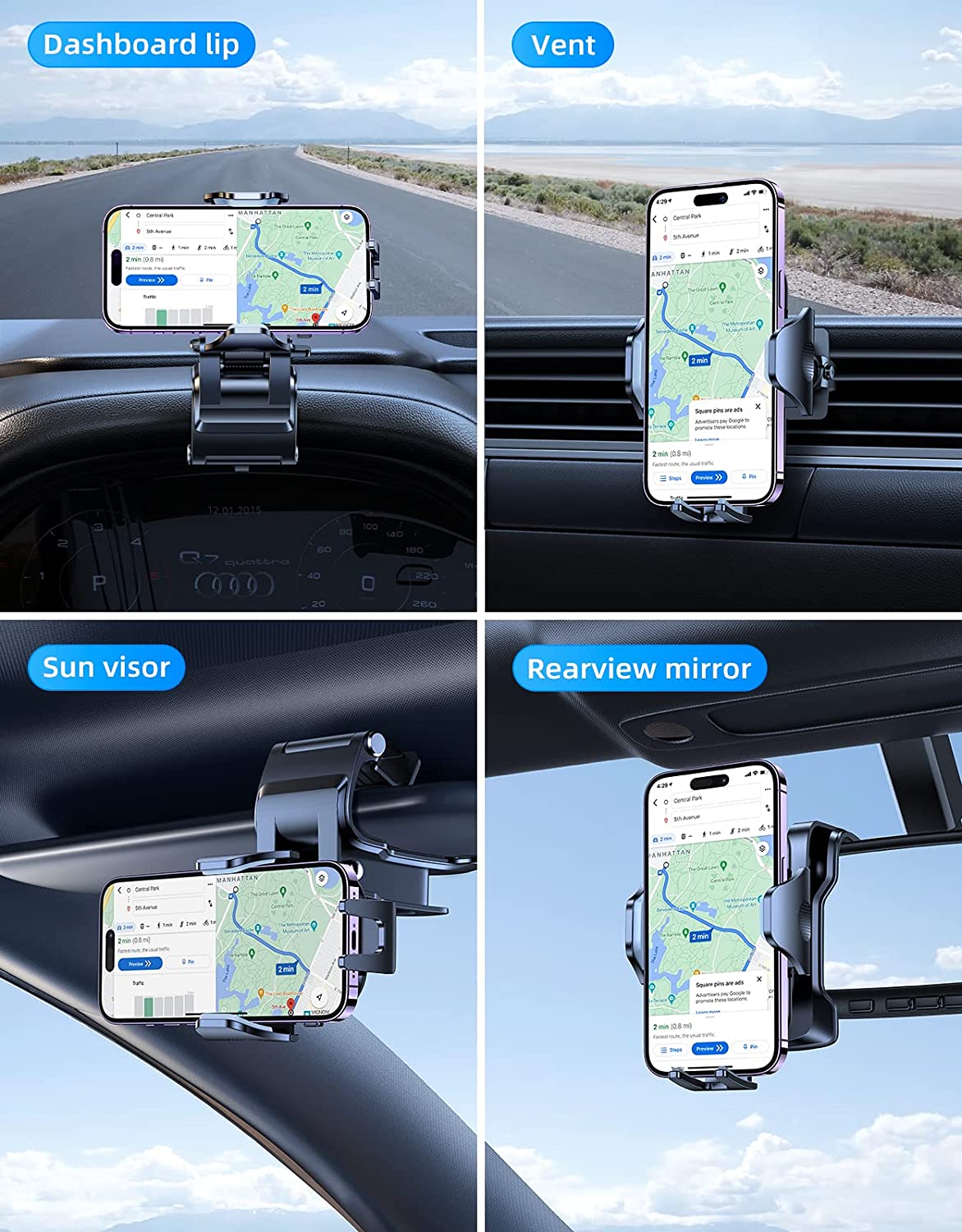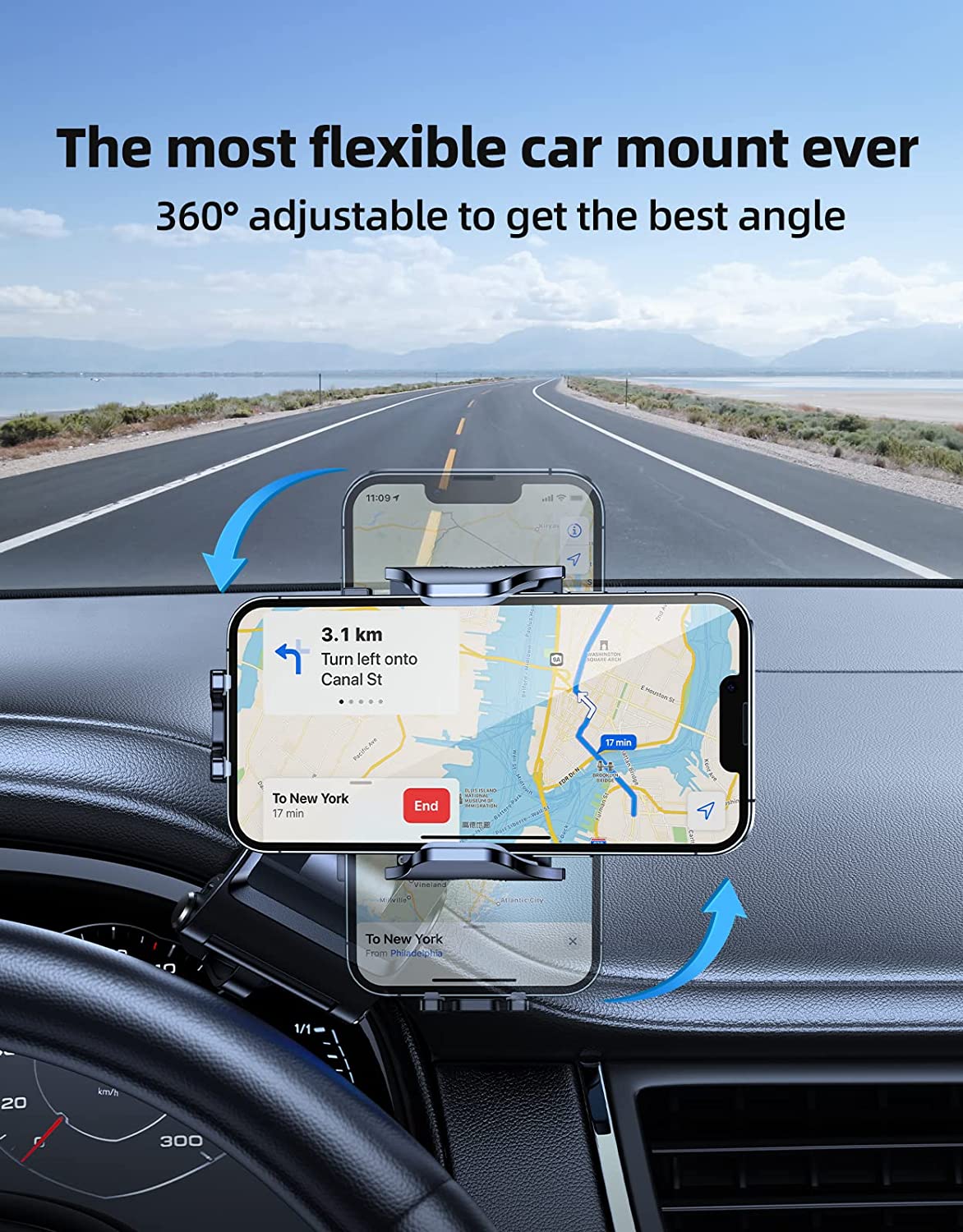 • [ 360° Car Cell Phone Holder ] Extremely flexible, easy to get the best angle. With the flexible 360 ball joint, The cell phone holder for car allows you to view your phone horizontally, vertically, and any angle with just one hand operation. Easy to get the best viewing angle to see GPS without blocking the vision of the road