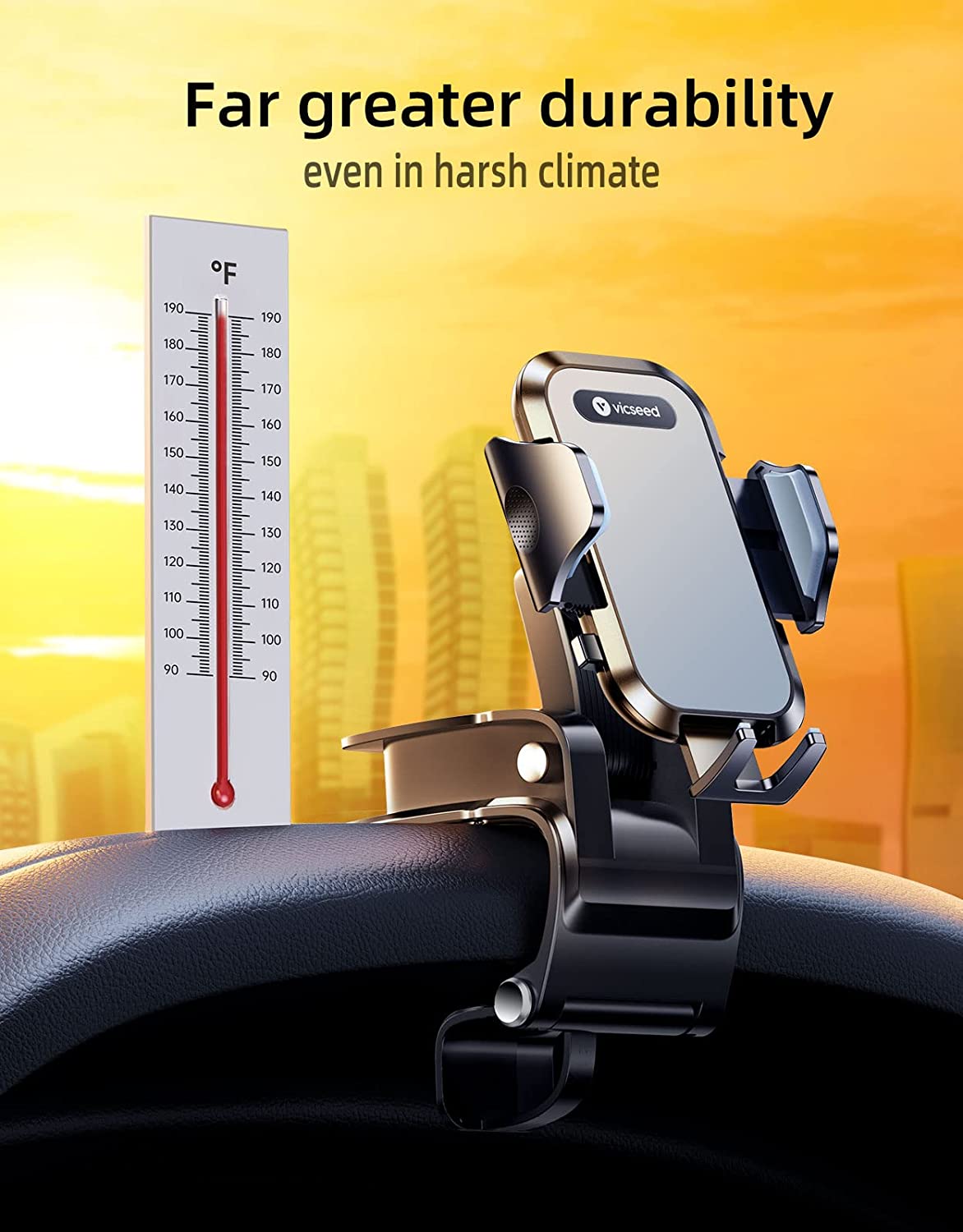 • [ Military Grade Phone Holder for Car ] It’s a car holder for cell phone that is made with military-grade material-polycarbonate PC2805 and Sabic 9134, which are harder than most metals and tougher than any car cell phone mount. Help to protect against nicks, scratches, and everyday wear and tear. Stay strong even used for 10 years