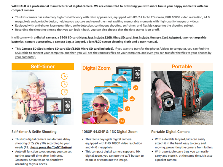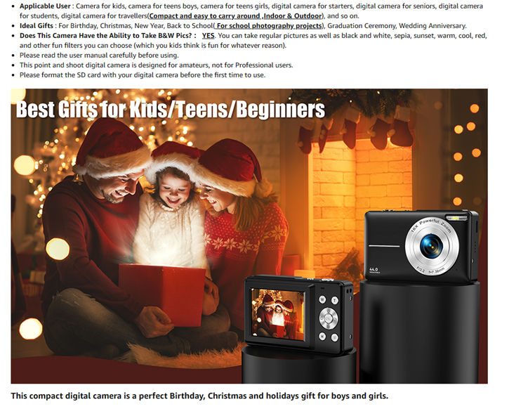 - 【FHD 1080P & 44MP DIGITAL CAMERA】: This compact digital camera for indoor/outdoor can be used for making video features with Full HD 1080P video resolution, this portable digital camera can capture 44.0MP image resolution & support 16X digital zoom, helping you capture and record the most exciting memorable moments with high-quality images or videos. This rechargeable digital camera is perfect for recording happy moments with friends, family members, and classmates indoors/outdoors.