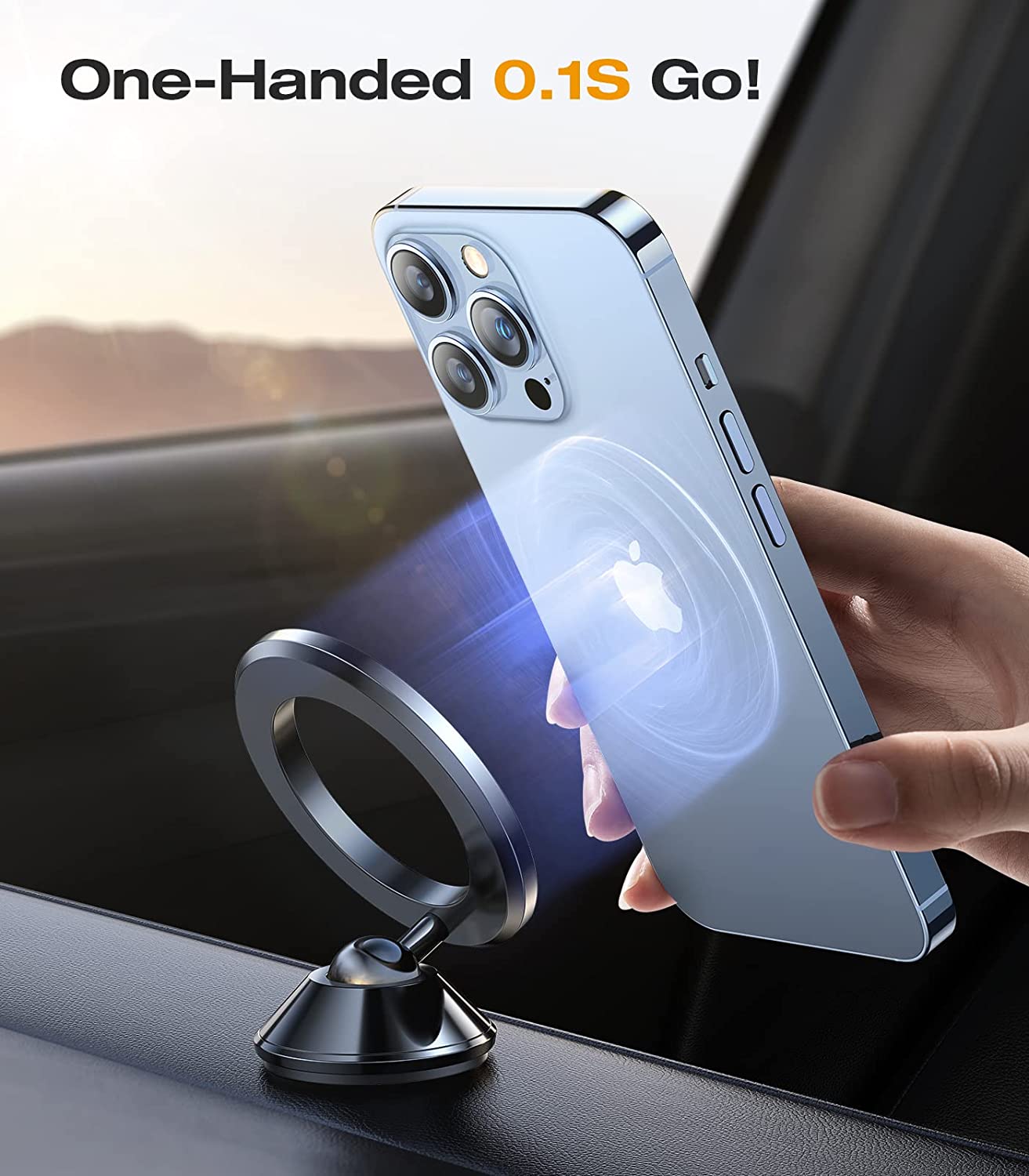 ?Designed for Magsafe Precisely - Most stylish iphone car holder magsafe in 2022 is specially designed for iPhone12/13/14 Pro Max Mini & official MagSafe cases & other magnet cases, which can attach these phones directly without the hassle of sticking metal plates. The magnetic car phone mount for iphone will automatically aligns and snaps to your iPhone, just need you make 1 placement motion with 1 hand to use, saving your precious time