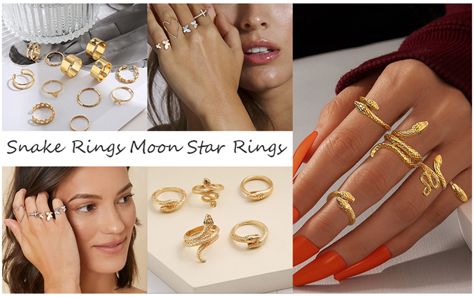 You will get down stacking ring set,these rings contain various fashion elements;butterfly, snake, star, moon...