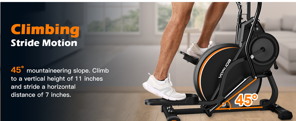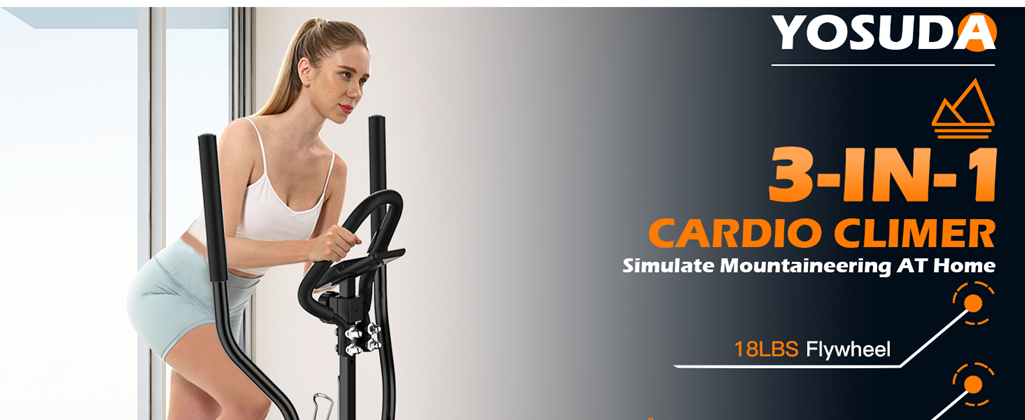- 【3-IN-1 Home Gym Equipment】YOSUDA elliptical stepper combines the easy, low-impact motion of an Elliptical, and the cardiorespiratory improving power of a Stepper, with calorie burning power of a Treadmill. Extended vertical and horizontal stride length produces a fluid climbing motion aimed to engage your whole body.