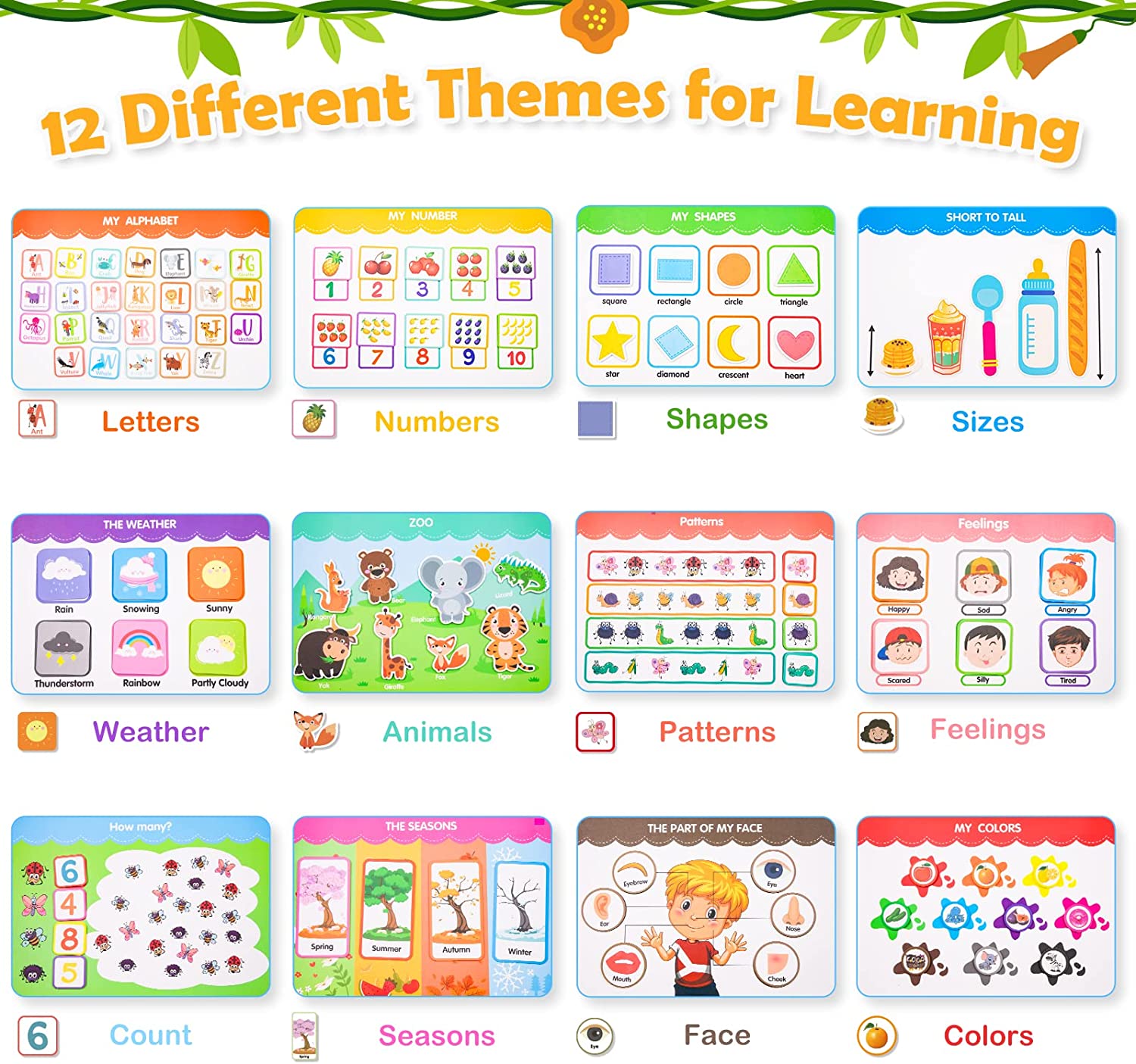 • 【Toddler Activity Book with 12 Themes】This preschool learning book is designed with 12 themes for children to learn. Toddler book includes letters, numbers, shapes, sizes, weather, animals, match patterns, feelings, count, seasons, facial recognition, and colors.