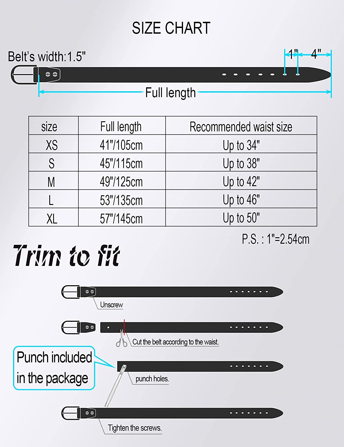 [Perfect Fit]: There are 7 holes on the mens belt to make belt fits more waistline size. Each product comes with a puncher so that you can remove the belt head to adjust the belt length according to your waist size.